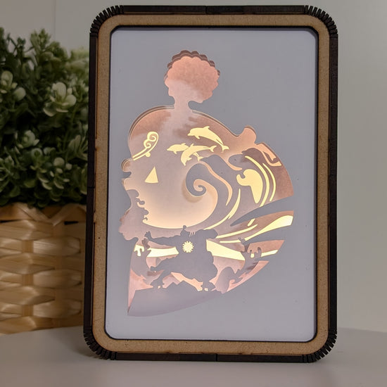 This A6-sized multi-layered artwork captures Jinbei in action, unleashing the power of Fishman Karate, set into a handcrafted MDF wooden frame with warm LED fairy lights to enhance the impact.